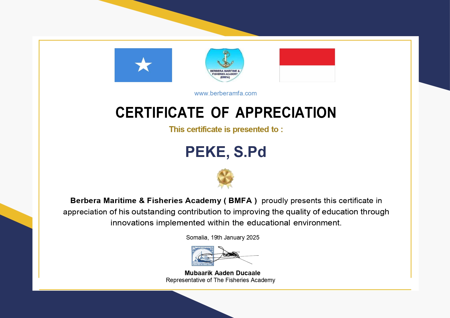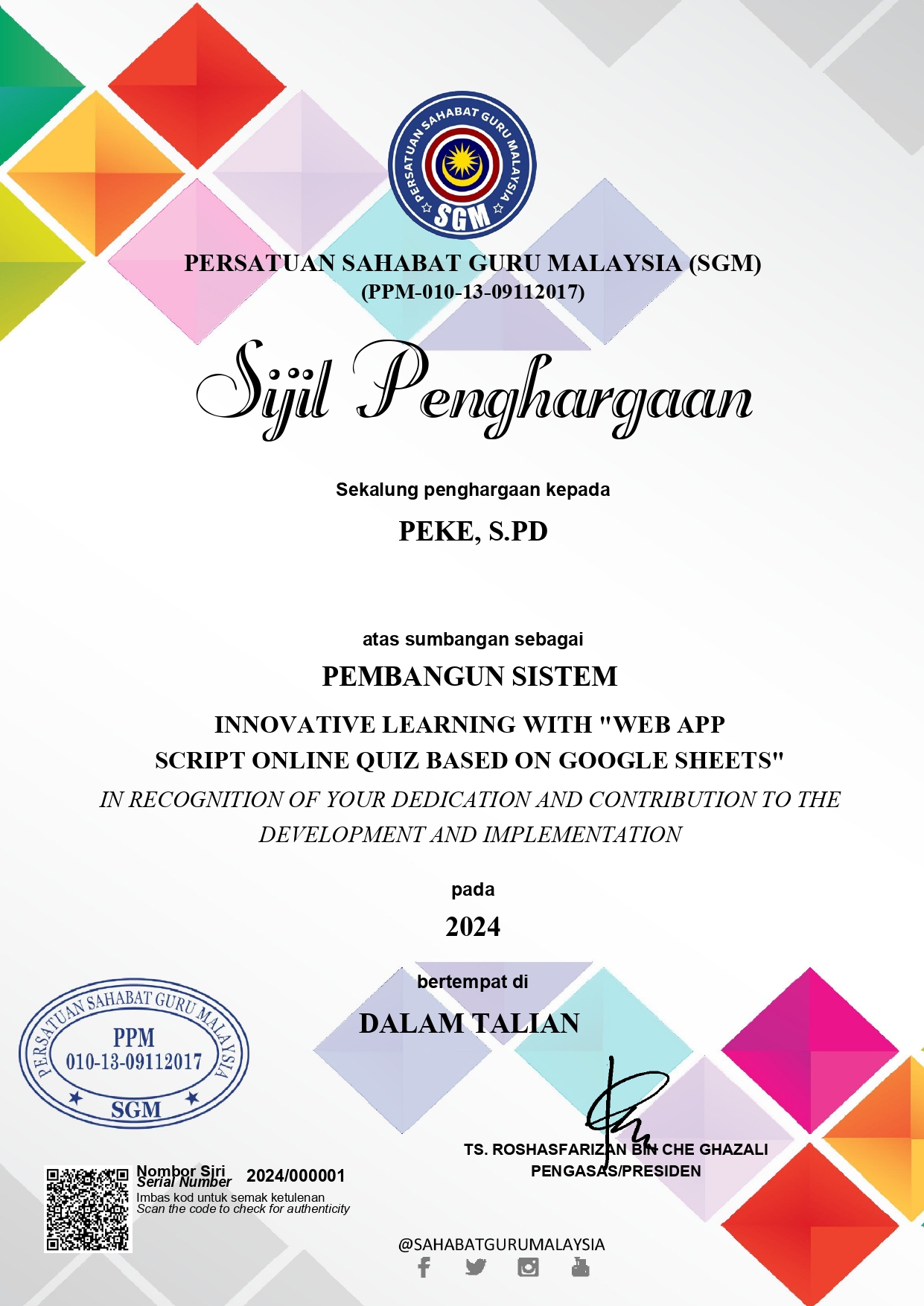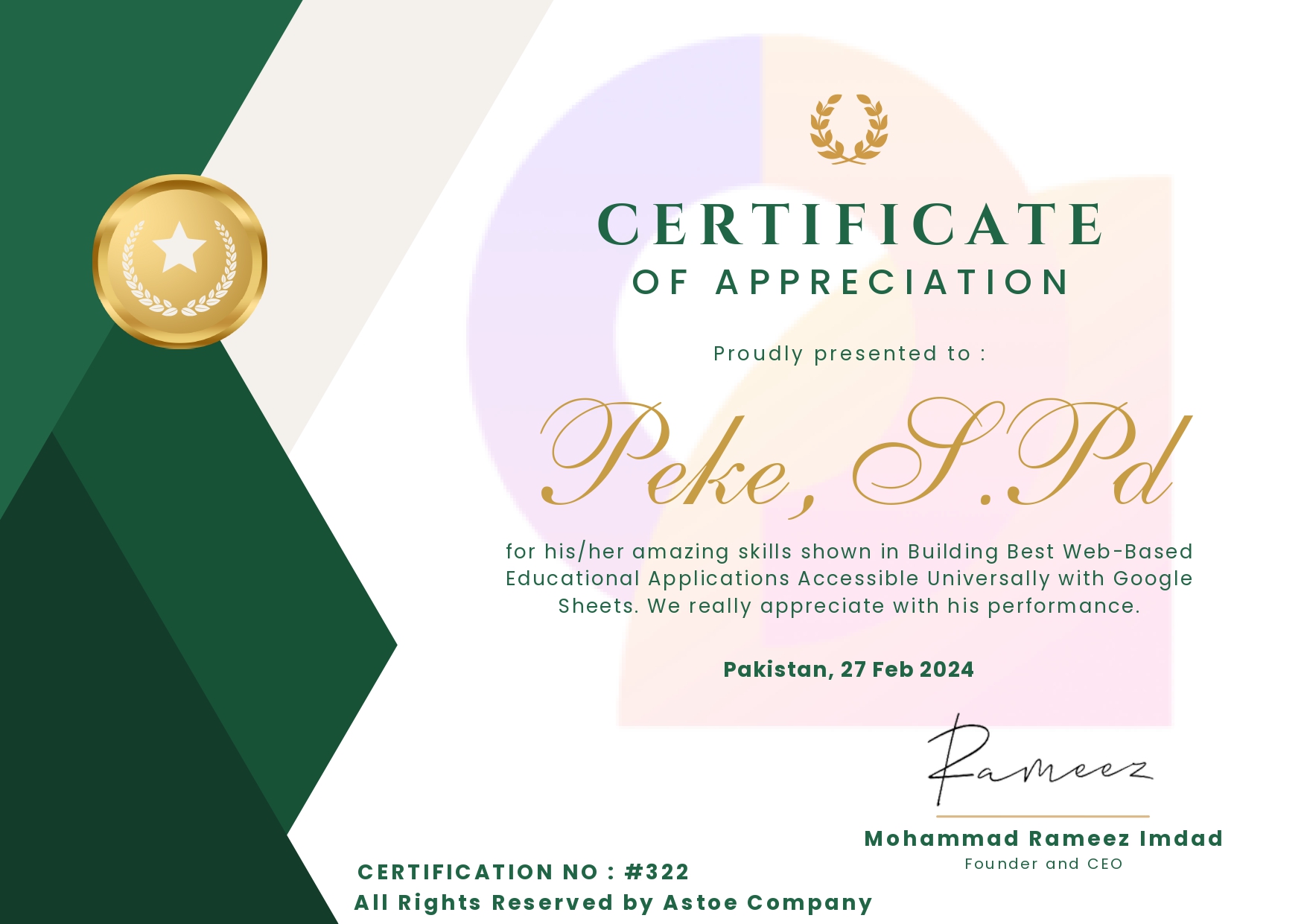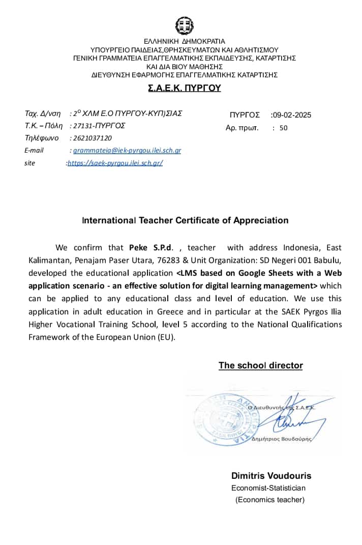 International Teacher Certificate of Appreciation. Web Based Google Sheets - Digital Learning Management (LMS).